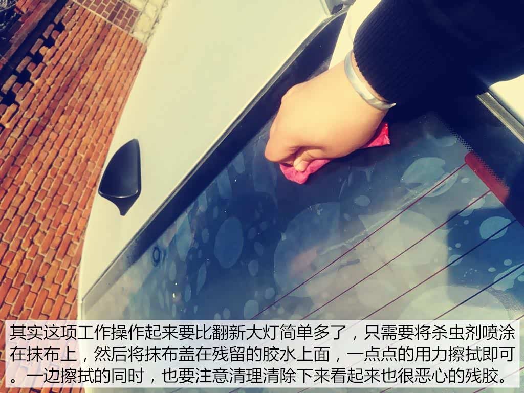 其实这项工作操作起来要比翻新大灯简单多了,只需要将杀虫剂喷涂在抹布上,然后将抹布盖在残留的胶水上面,一点点的用力擦拭即可。擦拭一段时间过后,在抹布的周围以及抹布上会出现被除下来的胶水,被搓成了一粒一粒的,一定要及时清除,不然时间长了或者不小心按到了还是会重新粘在车玻璃上。