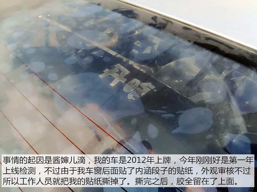 不过我的车是2012年上牌,刚刚好过了六年免上线检测,今年是第一次上线检测。丝毫不意外,我的段子车贴就被工作人员撕下来了。由于这张贴纸已经贴了有两年了,被太阳烤的胶太老了,所以都被留在了车玻璃上。本来想到家之后用化油器清洗剂清理的,可是在家里翻来覆去就是找不到。