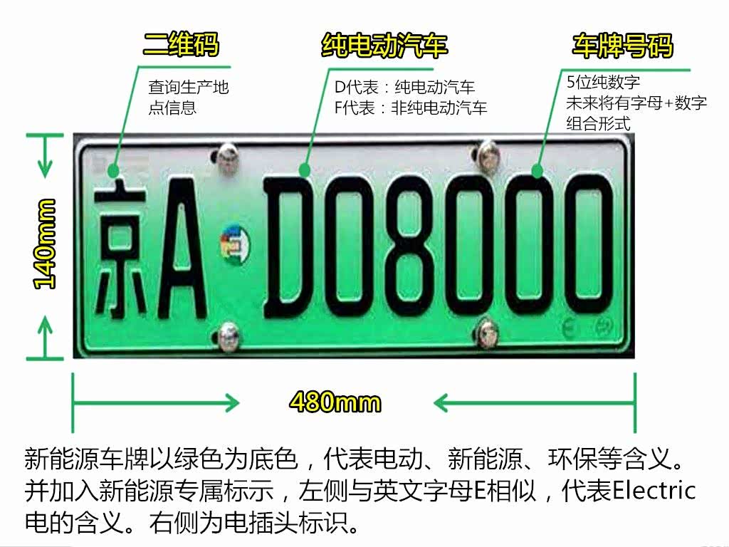 【纯绿色】小型新能源汽车【黄+绿底色】大型新能源汽车【字母D】纯电动车【字母F】非纯电动车