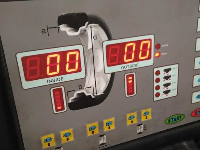 第四步:将轮胎装回轮毂并充气后放上专用工具上做轮胎动平衡,这一步十分重要,切勿忽视了,因为加装了内置传感器会打破原有轮胎的平衡,通过在相应位置粘贴铅块再通过仪器校准重新达到平衡。