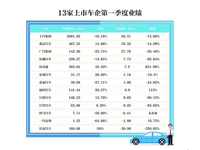 完全统计,在已公布一季度报告的13家车企中,除比亚迪、福田汽车实现营收、归属于上市公司股东的净利润双增长外,其余11家车企一季度表现均不理想。