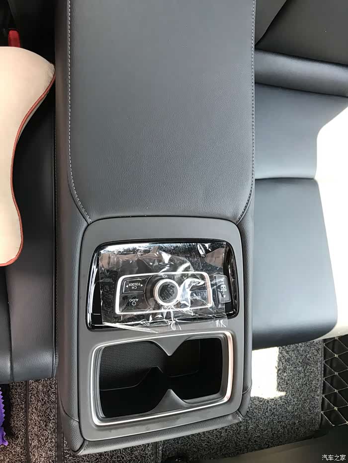 后排多功能扶手箱,目前也没有使用过,膜都还没有撕掉。