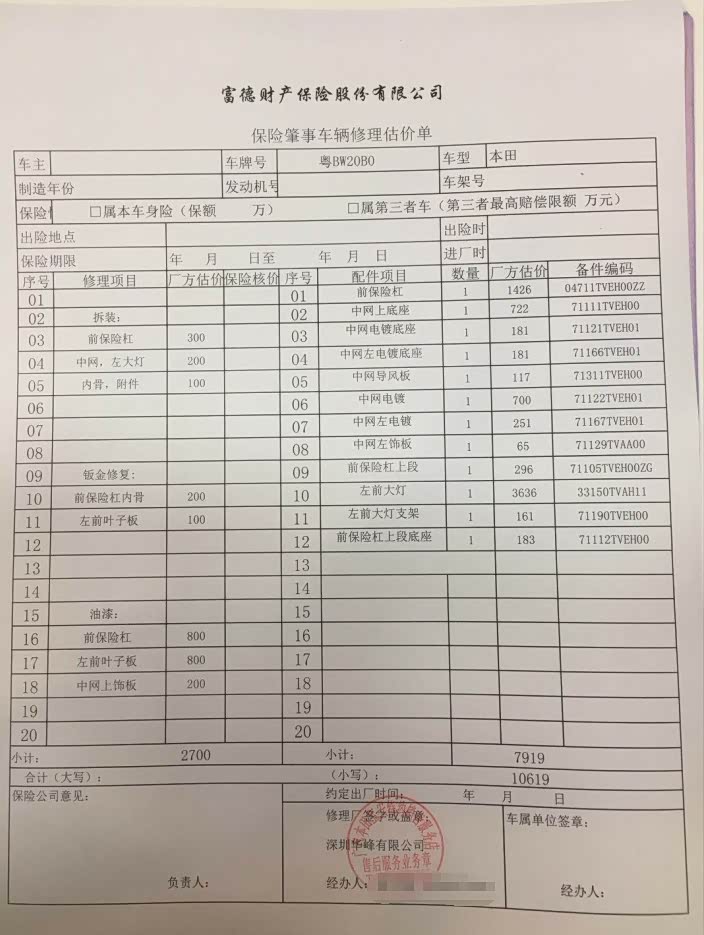 车辆维修估价单