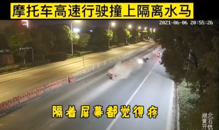 近日,黄石市开发区·铁山区辖区大棋路段,一女子驾驶摩托车高速行驶,失控撞上路中间设置的隔离水马,当场造成数十节水马损毁。