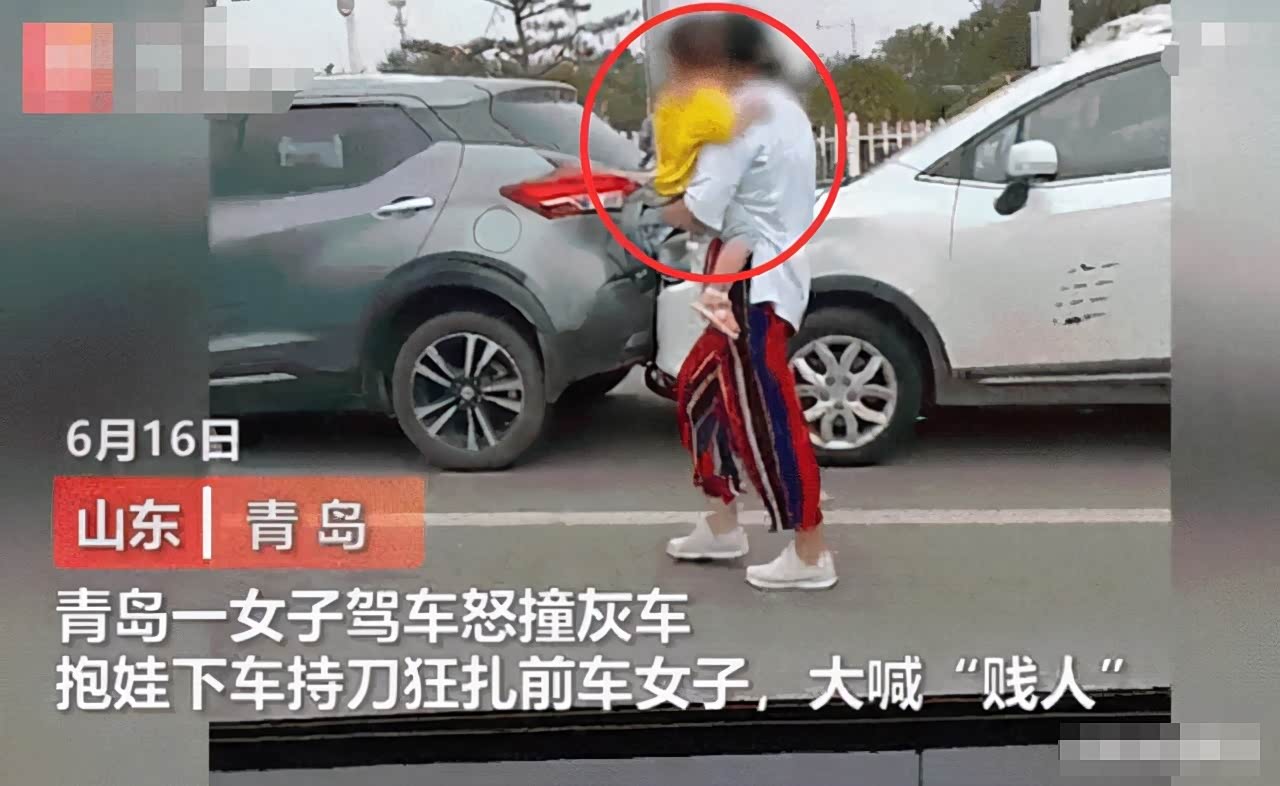 6月16日,山东青岛,一辆白色轿车主动撞向一辆灰色轿车,灰色轿车停下后,白色轿车又撞了灰色轿车一次,随后白色轿车上下来一名身穿白衣女子,一手抱娃,一手拿着一把刀,直接从驾驶座车窗将手伸进去,直接往灰色轿车的司机身上扎。