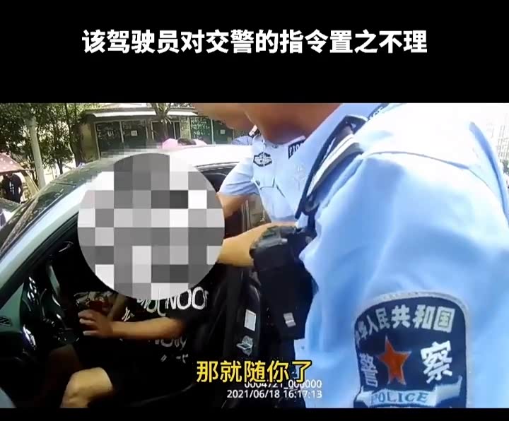 交警继续坚持男子下车接受检查,男子说:“你们上来一个人。”交警未上车,男子突然说:“那就随你了。”对交警的指令置之不理。