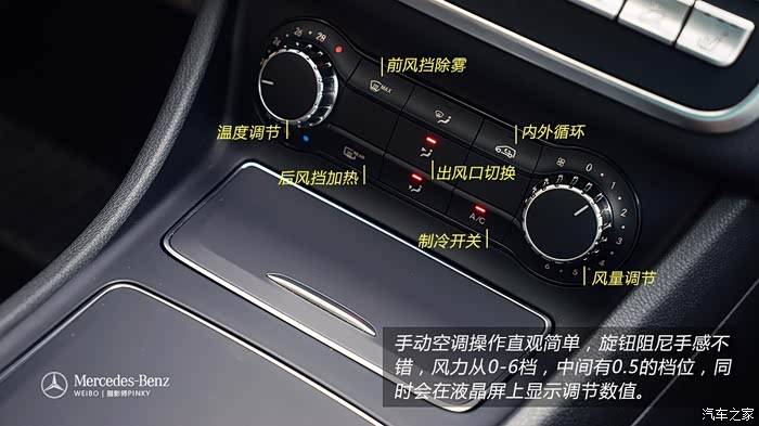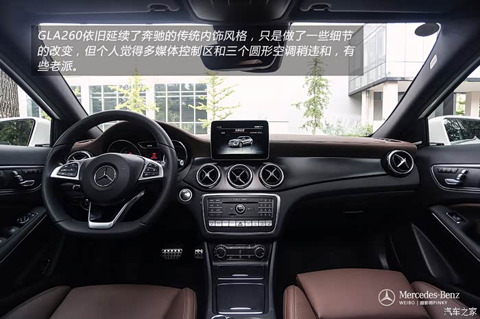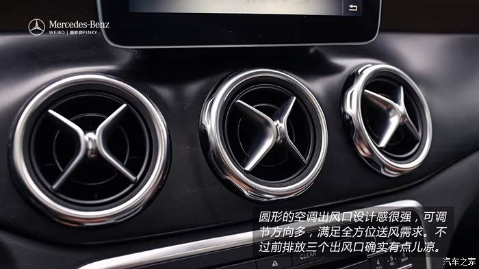 GLA 260 4MATIC依旧延续了奔驰的传统内饰风格,只是做了一些细节的改变,比如档把还是采用的怀挡,新款采用了一键启动。三幅式运动方向盘,真皮的握感很好,并且很有安全感,增加了提升驾驶乐趣的换挡拨片。双炮筒设计仪表盘突显运动感,和空调出风口呼应,黑底白字更加容易辨识。圆形的空调出风口设计感强,可调节多个方向,满足全方位送风需求,顺时针旋转为关闭,逆时针为开启。个人觉得多媒体控制区和三个圆形空调稍违和,有些老派。