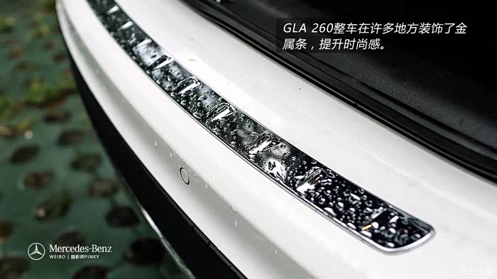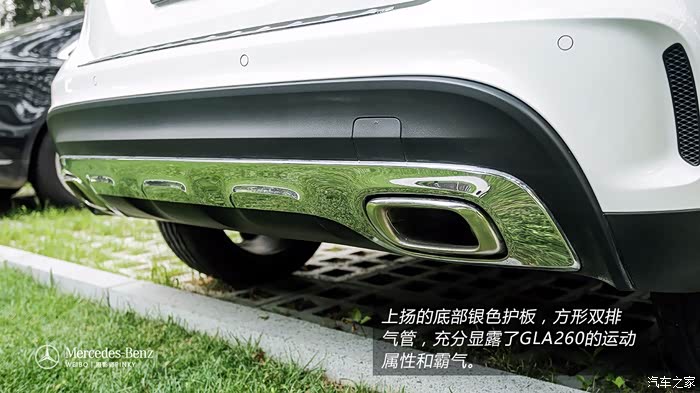 不能否认,我在选车的时候的确是外观控,GLA 260具有家族传统的凌厉的前脸设计,宽厚的进气格栅,在刀锋式的进气格栅上做了打孔处理,丰富了造型的层次,在保持奔驰SUV特点的同时更加前卫时尚。全车许多地方装饰了金属条,提升时尚感。GLA 260在前唇和尾下方都加装了宽大的银色护板,2017款在细节上做了改动,使护板面积更大,方形的双排气孔,充分显露了运动属性和霸气。侧面线条流畅,1535mm的低矮车身让它看起来更像一辆轿跑,但是204mm的离地间隙说明它仍旧是一辆SUV。