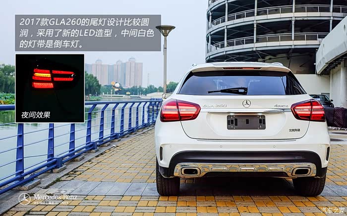 GLA 260与新A级统一的柳叶眉大灯设计,在旧款上都使用的氙气大灯,而2017款则改用全LED大灯,美观与实用兼具,新款尾灯设计也采用了新的LED造型,中间白色灯带是倒车灯,后视镜上集成了家族传统双条型燕尾式设计的LED转向灯。