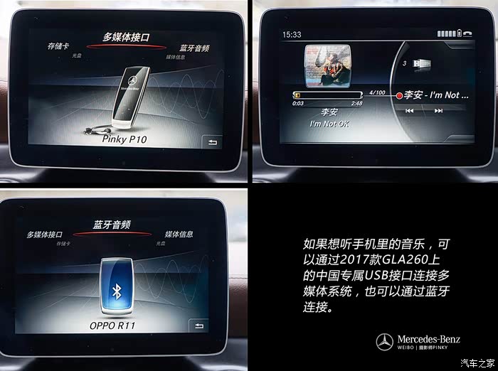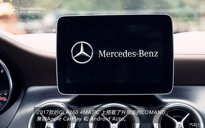 GLA 260 4MATIC上搭载了升级版的COMAND,兼容Apple CarPlay和Android Auto,都通过杯架旁边的旋钮控制,液晶屏如果做成触摸屏会更方便吧。如果要听手机里的歌曲,可以用数据线通过车上中国专属的USB接口连接多媒体系统,也可以通过蓝牙连接。