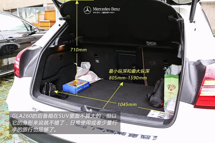 GLA 260的高度确实很适合我,下车时伸腿就能踩到地了,唯一就是车窗部分的高度低了一些,顶棚也是稍低,个子高的可能会磕头,当然,这也是源于它低矮的车身和204mm的离地间隙,自然会压缩高度。2017款的GLA 260增加了后备箱感应开启,当双手都被占用的时候用脚划过后备箱下部就可以实现开启。后备箱在SUV里面不算大的,但以它的身形来说已经不错了,日常使用或者少量行李的自驾游旅行也是足够的。
