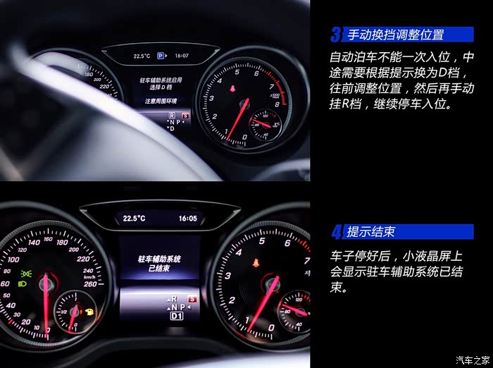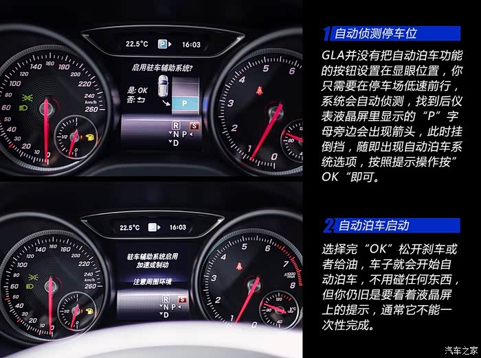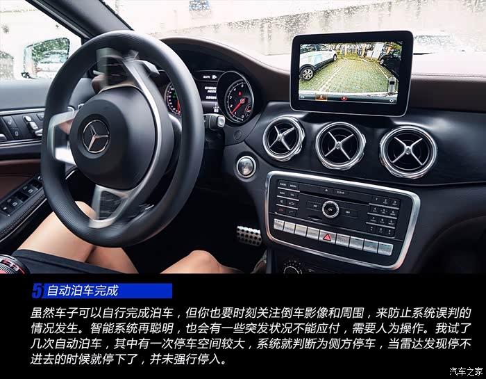 GLA 260 4MATIC上有自动泊车功能,但可能并不能在表面上找到开关,只需要在停车场缓慢行驶(10km/h 以下)系统会自动侦测,找到后仪表液晶屏的上面显示的“P”的旁边会出现箭头,不过据我测试,并不是特别敏感,需要多开出点儿距离才行,而且当车位很大的时候,它可能还会出现误判,当雷达发现停不进去的时候会停下,撞上倒是不会。但我还是比较喜欢自己停,更快速。对于新手来说应该是个非常省脑子的功能,毕竟看液晶屏提示就可以搞定停车。