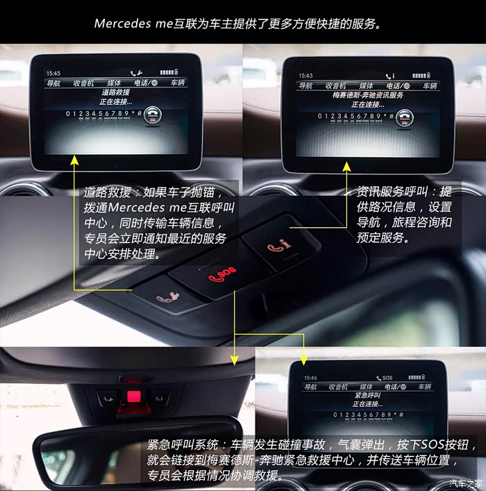 当时挨个按了Mercedes me互联功能的按钮,服务专员的态度非常好,耐心帮我解释了三个按钮的功能。我也测试了SOS,没有拨通的时候我觉得过分就挂断了(长按红钮就是挂断),但是后来服务专员又回拨回来问我是不是发安生了什么事情,这服务我给点赞Mercedes me互联功能为车主提供了更多更方便快捷的服务,咨询服务呼叫可以提供路况信息,帮助车主设置导航,旅程的咨询和酒店预订服务;车子抛锚了就联系道路救援,系统会同时传输车辆信息到呼叫中心;车辆发生碰撞,按下SOS按钮,会连接到梅赛德斯-奔驰急救援中心,并传输车辆位置,专员会根据情况协调救援。