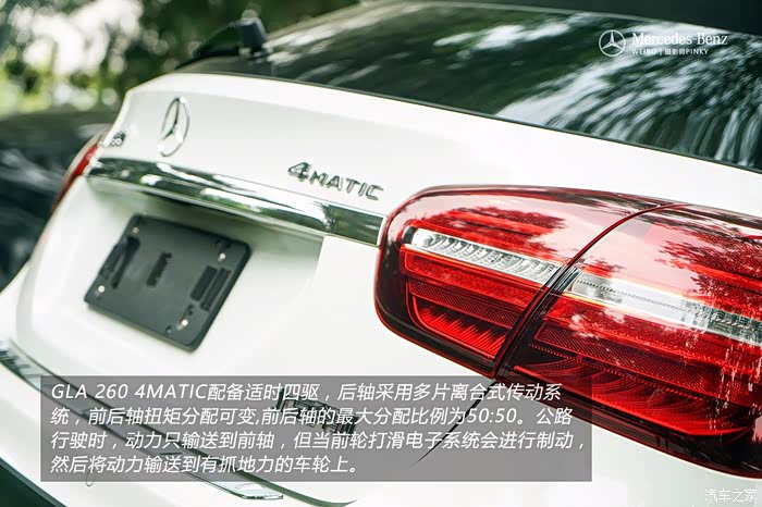 GLA 260 4MATIC配备了高功版2.0T直喷发动机,7速双离合和变速器,最大功率155kW,峰值扭矩为350Nm,百公里加速成绩为7秒,可见运动性能更为出色。试驾最大的感受就是涡轮介入并不突兀,换挡平顺,无顿挫感,动力充沛,几乎没有时滞,方向盘重量适中,操控感出色无飘忽感,这种迅速反应和出色的动力,简直令我着迷。GLA 260 4MATIC还配备了适时四驱,后轴采用多片离合式传动系统,前后轴扭矩分配可变,最大分配比例为50:50,公路行驶时,动力只输送到前轴,但当前轮打滑,电子系统会进行制动,并把动力输送到有抓地力的后轮上。所以,GLA 260 4MATIC并不是一款只有颜值的车子,它更是一款能让你充分享受驾驶乐趣的性能SUV。
