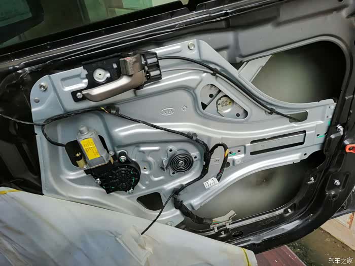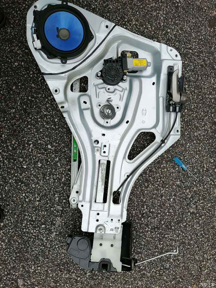 取出将电线固定在车门上的所有卡扣,拧开所有螺丝,将玻璃升降器和闭锁器一起从车门上取下来。