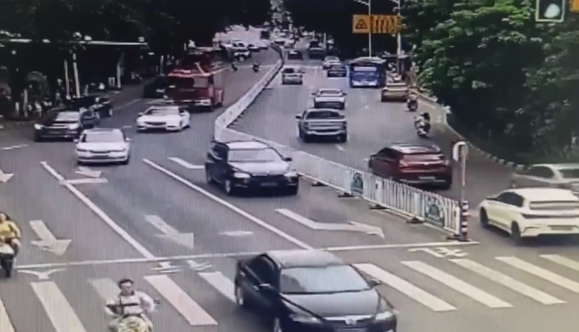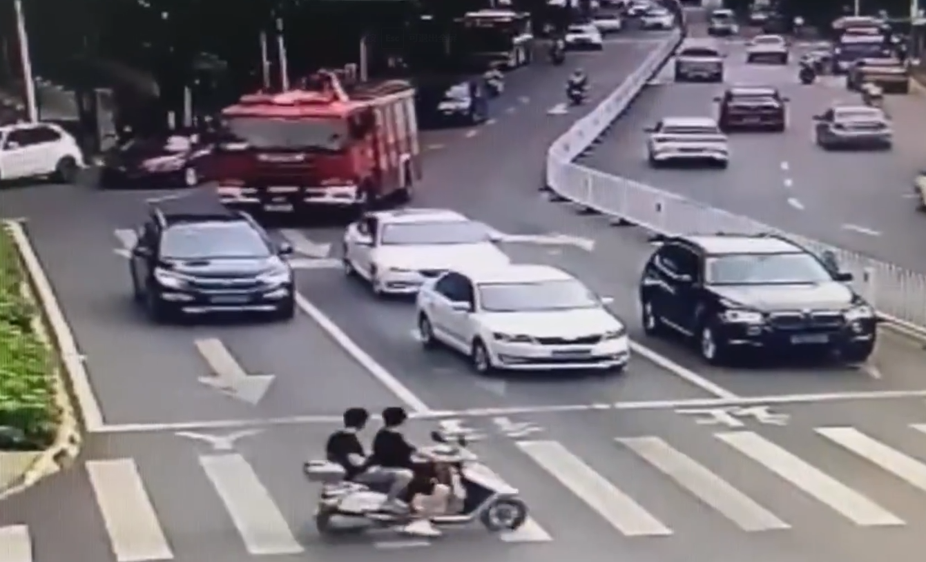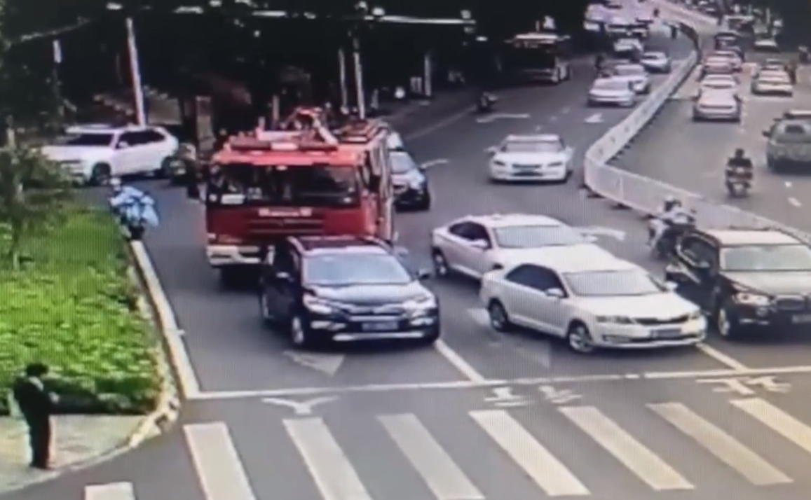 然而半路却被一辆黑色SUV轿车给挡住了,消防车司机非常着急,于是不停按喇叭想让车主主动避让。