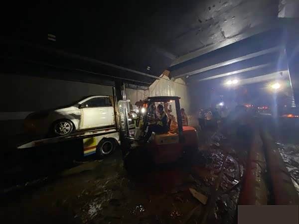 南出口处进入攻坚阶段,基本见底但隧道内污泥较多,抽排难度大,预计今天内积水抽排完毕。