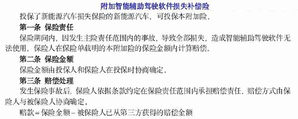 此外,意见稿中还有附加智能辅助驾驶软件损失补偿险。保险责任为,在主险责任范围内的事故,导致全部损失,造成智能辅助驾驶软件无法使用,保险人在保险单载明的本附加险的保险金额内计算赔偿。其意思就是,如果车辆因事故导致全损,而早前车主单独购买的智能辅助驾驶功能无法使用,也会对其进行保险赔付。例如,车主购买了一辆特斯拉Model3时,还选购了6.4万元的FSD驾驶套件。如果车辆因为事故,保险公司给出全损理赔。如果车主购买有"附加智能辅助驾驶软件损失补偿险",保险公司同样会对购买的FSD软件进行理赔,具体赔付金额多少,金额由保险公司来确定。