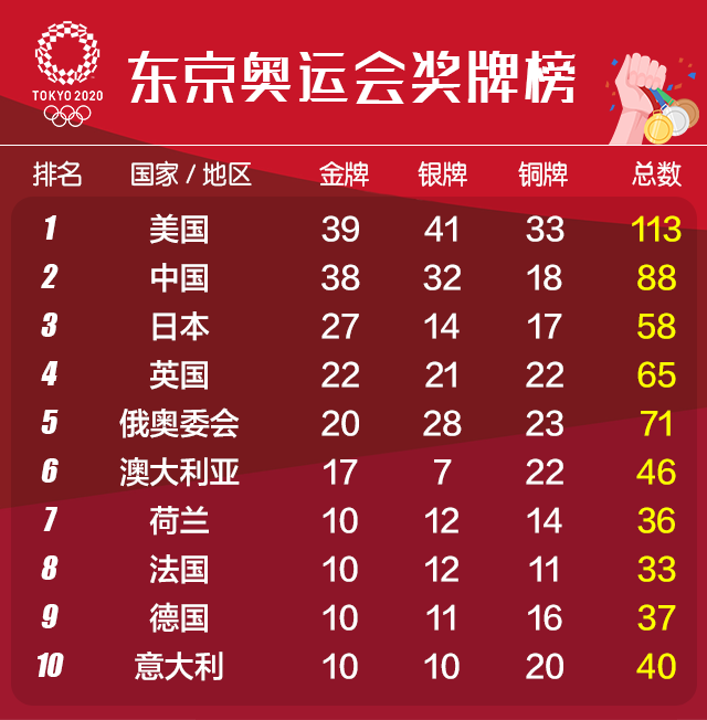 东京奥运会中国体育代表团共获得38金32银18铜共88枚奖牌,金牌数、奖牌数仅次于美国,位居第二,追平在伦敦奥运会取得的境外参赛最好成绩。