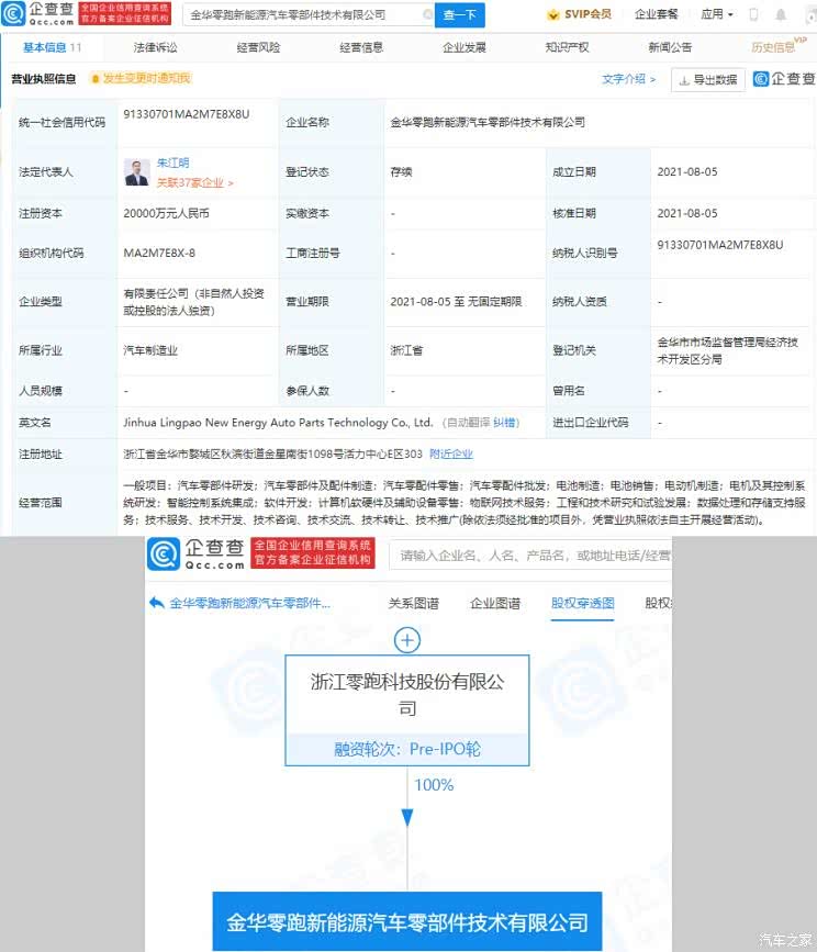 根据相关企业信息显示,金华零跑新能源汽车零部件技术有限公司法定代表人为朱江明,注册资本2亿元人民币,经营范围包含:电池制造、电池销售、电动机制造、电机及其控制系统研发以及智能控制系统集成等。