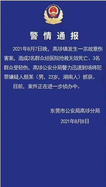 8月8日,东莞市公安局高埗分局发布警情通报称,8月7日晚,高埗镇发生一起故意伤害案,造成2名群众经医院抢救无效身亡,3名群众受轻伤,高埗分局警力迅速到场将犯罪嫌疑人颜某抓获,目前案件正在进一步侦办中。