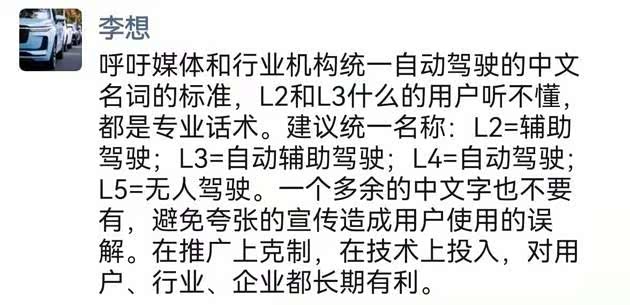 8月16日,理想汽车创始人李想发声,他呼吁媒体和行业机构统一自动驾驶的中文名词标准,建议使用统一名称,一个多余的中文字也不要有,避免夸张的宣传造成用户使用的误解。