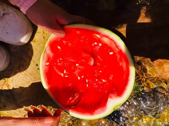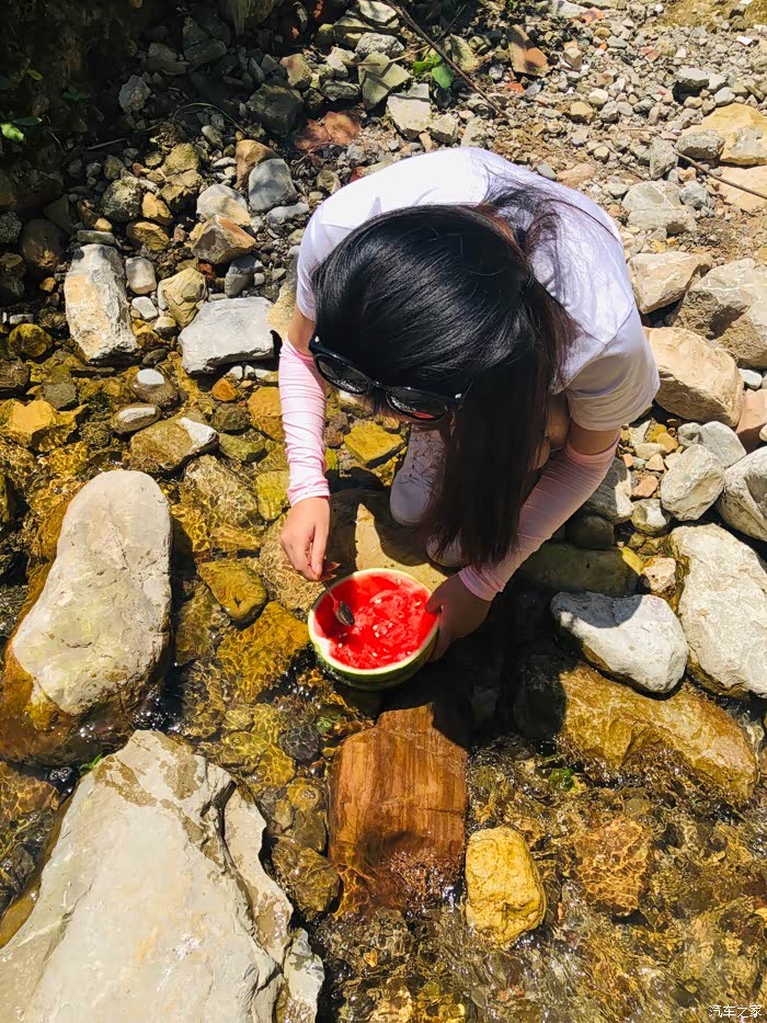 自己在家搬的西瓜,在这里用水泡了以后,一直吃,发现还挺好吃的哦,野外有更好的冰箱,所以应该点赞了,喜欢吃西瓜