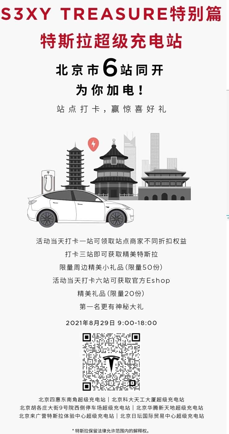 8月29日,特斯拉中国充电团队通过其官方微博宣布,北京特斯拉超级充电站6站同开