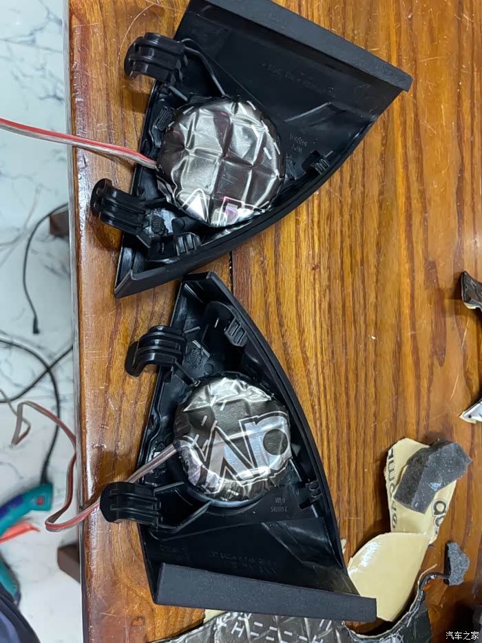 一对包好的图片这车还奔驰。。。高音都没有,低音只有副驾驶座有,主驾驶座也没有,一切从简了,不废话了。朋友那里一堆高音,全部飞线出来,试听各种音乐,最终选了彩虹DL6.2套装拆下来的高音。还有改舒适进入跟改电折叠后视镜,应该说加装舒适进入加装电折叠后视镜