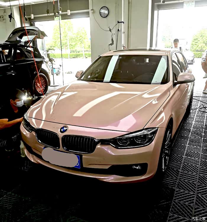 先说闺蜜的车,18款320li 时尚型,开了2年多,整体维持的比较好,原车身是白色,女人善变(漂亮性感的女人更是变化多端)贴樱花粉时,满脸的爱死的表情,不爱时也是万分嫌弃,先看车没改前的样子~