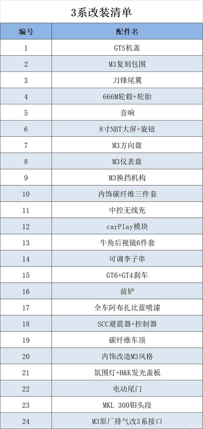 大清单:M3座椅、M3内饰风格改色、M3方向盘、仪表盘、换挡机构、音响、发光盖板