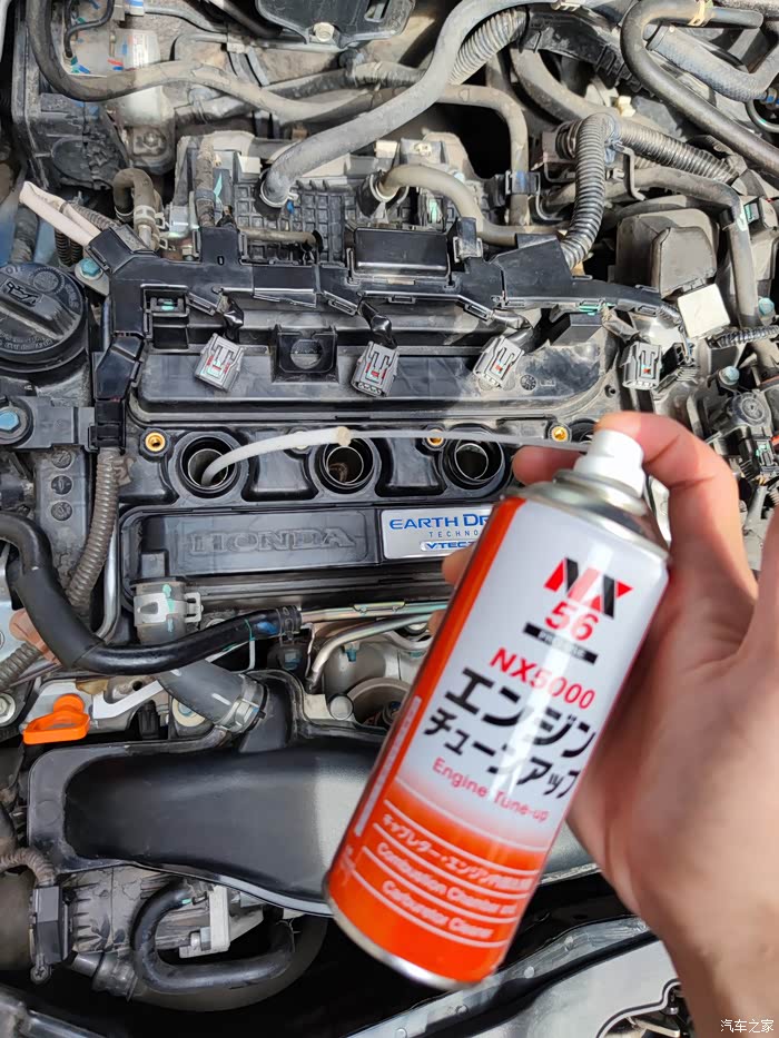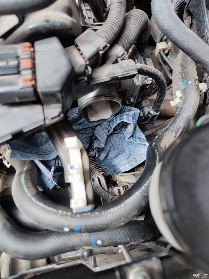 因为是自己一个人,没人帮忙踩油门,一个步骤需要通电油门到底,才可以喷清洁剂进去清洗,找了一根水管顶着