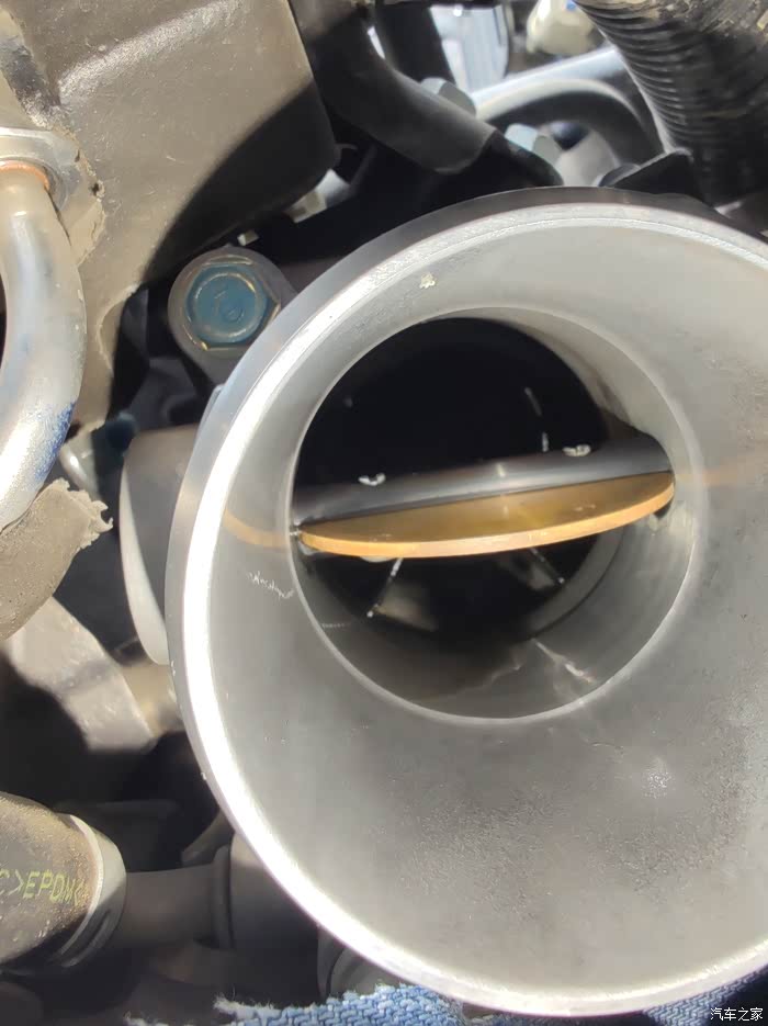 懒得拆出节气门清洗,这样简单一点,油门到底节气门全开的样子,里面也够黑的