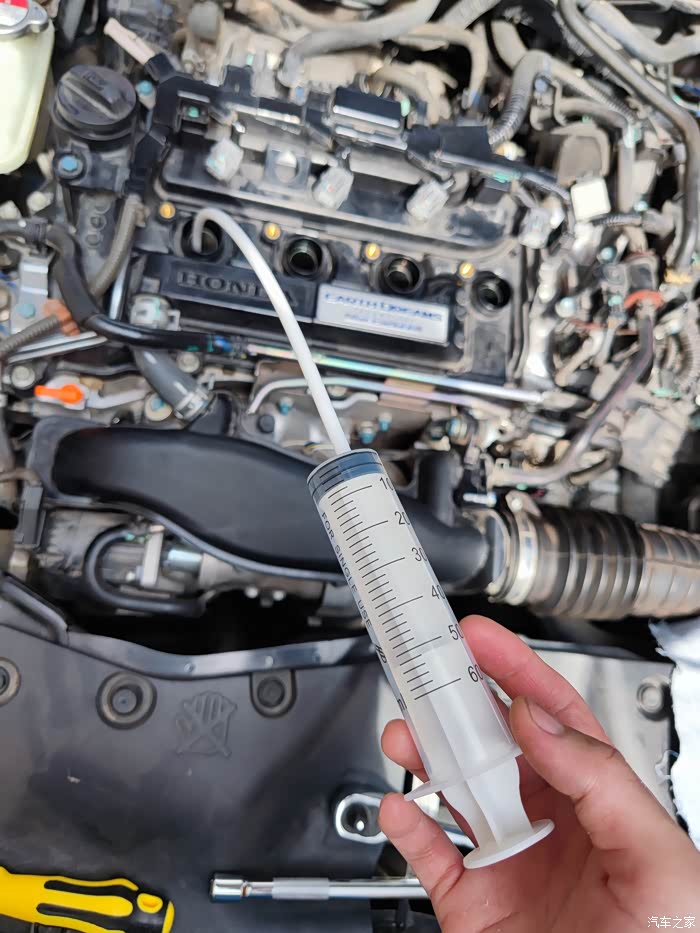 接下来就要用针筒吧积碳液抽出来,抽也干净也容易打着火