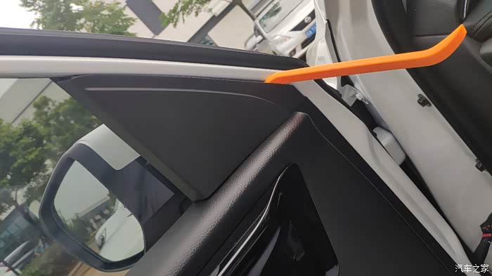 首先把车窗降下去,然后在这个三角形上边那个角扒开,第一个扣位就拆开了,然后用撬棒将里边的第二个扣位撬开,这个三角挡板就拆掉了。