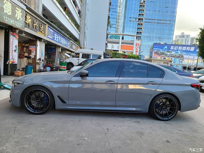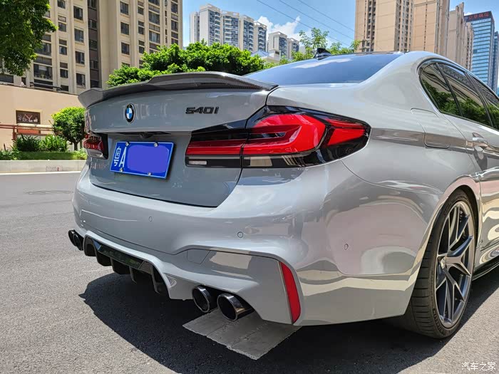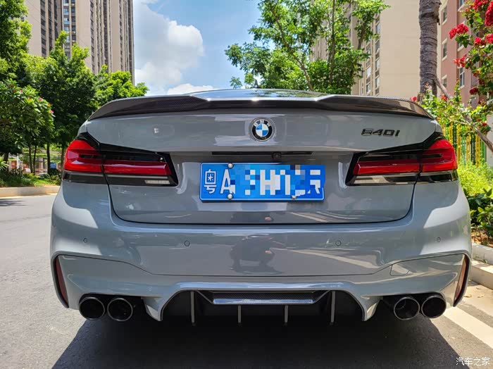 20款540i提车一年,从第一次改轮毂轮胎换排气,到第二次换避震刷程序,再到第三次改色贴膜换轮毂,走过弯路,被杀过猪,但一点点看着改变的结果,用车心情都越来越愉快了,每天忍不住多看几眼,值了!话说某天不小心刮到车,车衣受损严重不想要了,索性撕了贴个改色膜,顺便改了些碳纤维件做搭配,尾灯也换成21款,改完发现轮毂颜色不合适,又把轮毂给换了。
