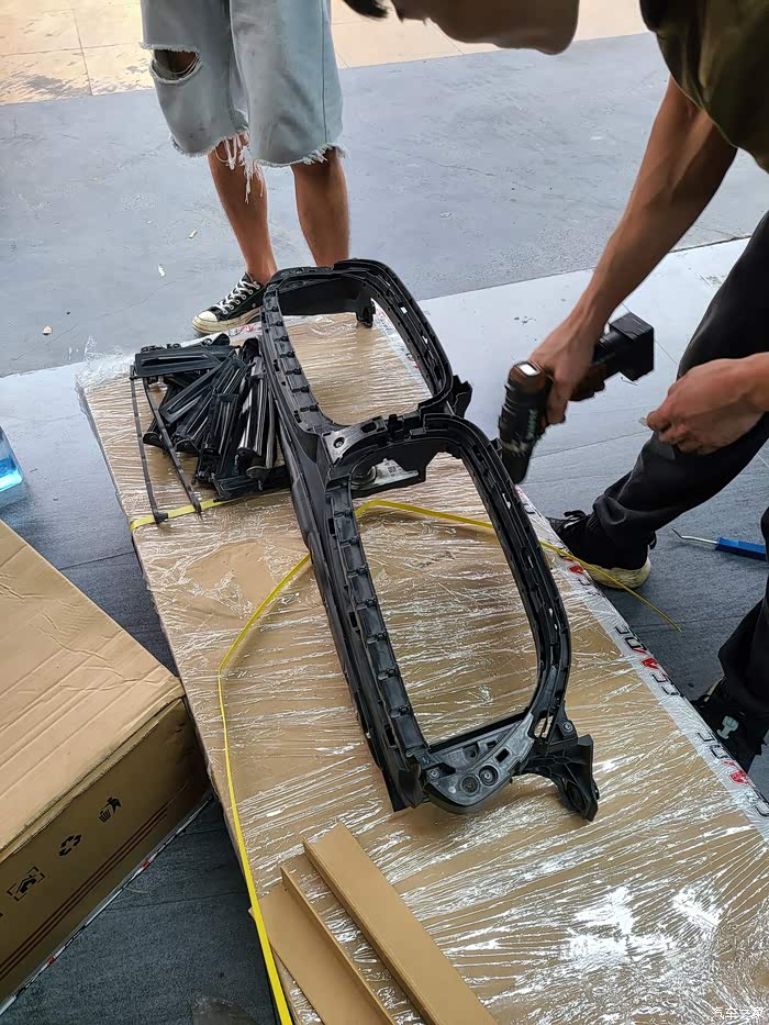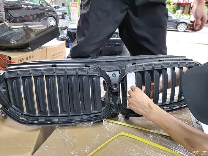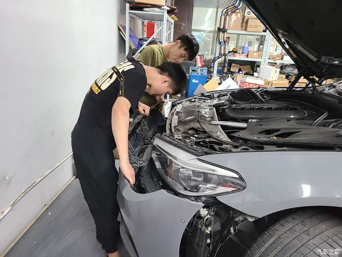 看完参考图留口水,车身颜色确定好了,贴的是AX高亮纳多灰,选好店家丢过去开始贴膜,同时让老板给装了MP侧裙,M5后唇+碳纤后扰流+AN尾嘴,21款尾灯,碳纤小前唇+中网,给师傅手艺点个赞,细节处理得不错。