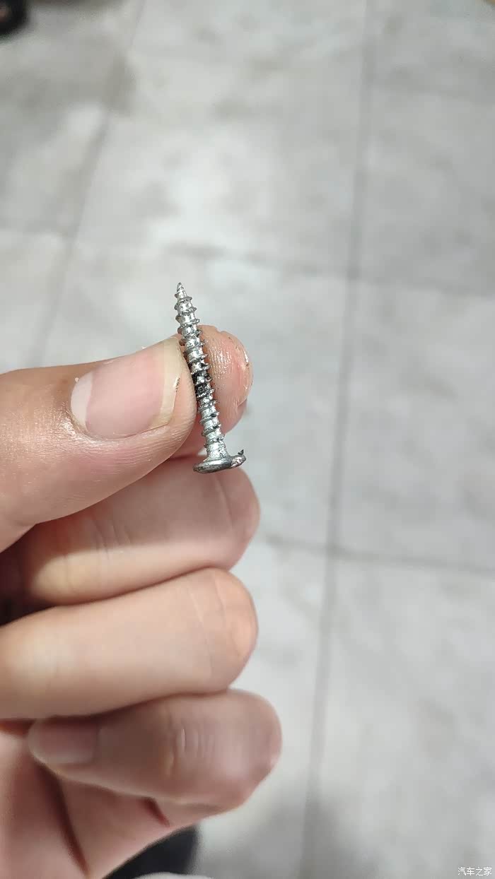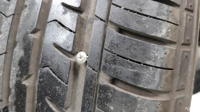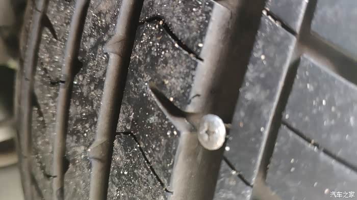 然后对这个没有气的轮胎仔细检查一下到底怎么了,发现一个螺纹钉。