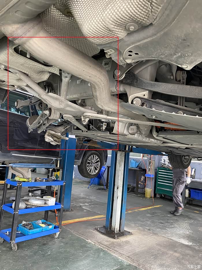2.把车用举升机举起来,用手扒在后桥那根粗壮的横梁上用力的去顶压,会传来吱嘎吱嘎的响声。