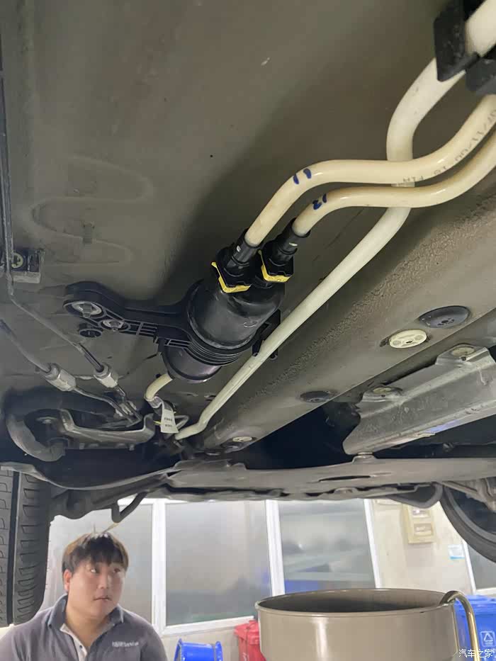 发动机下护板的支架,更换冷却液时候拆下下护板发现这支架有点变形了。估计有一次底盘蹭到泥块了。这玩意本来想换的,但是没有现货。维修主管拿着榔头直接过来帮我敲平整了。够狠,这玩意其实很便宜,150块钱。。。后面我看到更凶残的,直接撞得拧麻花了让维修小哥敲回来。。。把我看得目瞪口呆。其实这玩意也很牢的。
