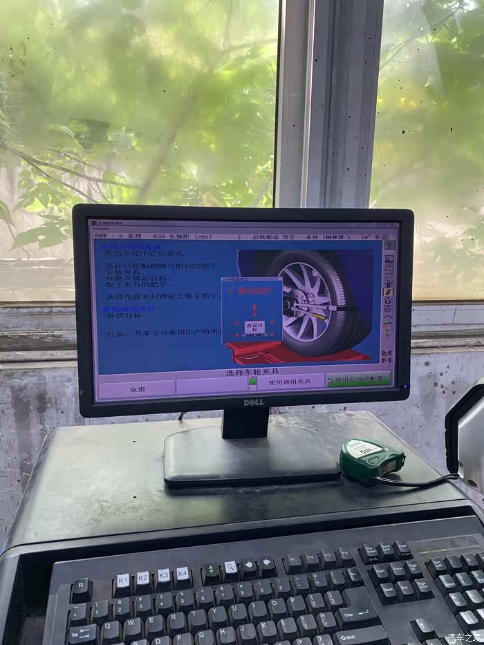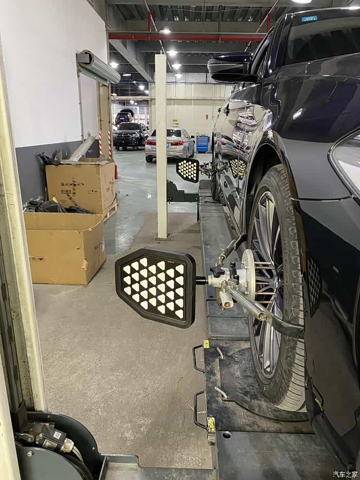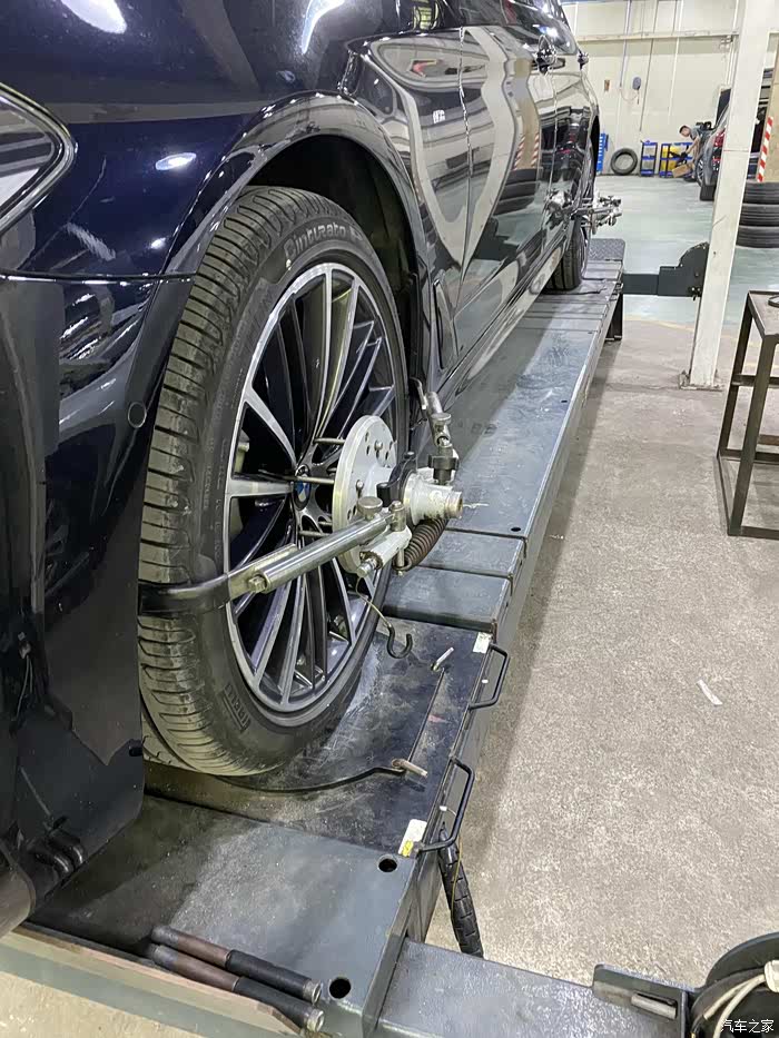 宝马4S店的四轮定位仪器还是很不错的。要输入胎压,还剩下多少厚度,轮毂最低到轮眉高度等数据。比外面通用性的四轮定位机感觉上牛逼多了。