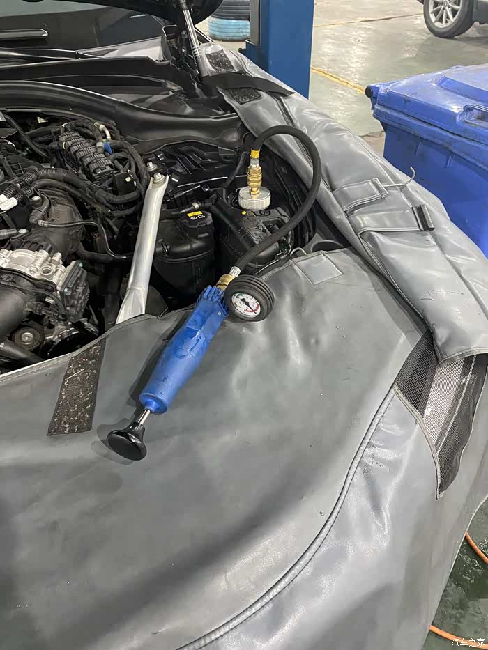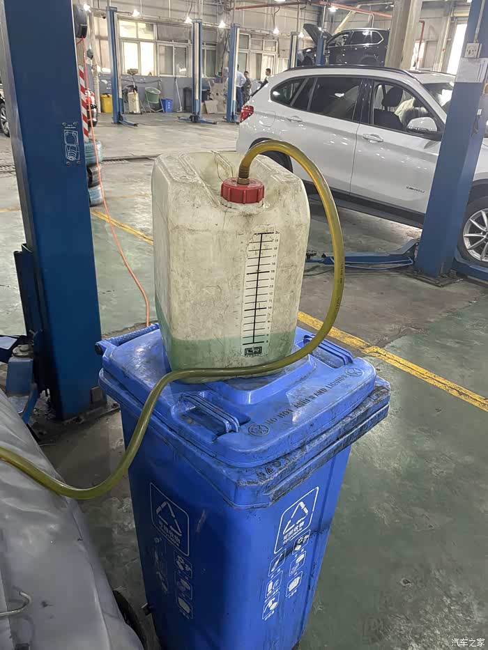 这次在4S更换冷却液,是想看看4S是怎么更换的,包括设备流程等。4S用设备更换完冷却液后,开启诊断模式,热车踩油门至3000转或3000转以上保持10-15秒,然后怠速30秒,反复5次。这好像是机械水泵排空气的方式。G38发动机冷却液是机械水泵。小壶低温冷却用的是电子水泵,排空气的方式不一样。F18上一代5系是用电子水泵。电子水泵的排空气方式和机械水泵不一样。换冷却液最怕的就是排空气排不干净,就会造成水温过高。