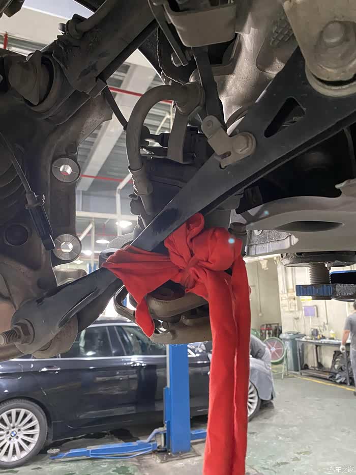 红红的布包着刹车分泵绑定在下摆臂上。维修手册要求拆下来的刹车分泵固定。挂着也没事,就怕把刹车油管啊,刹车警示线给弄坏了。