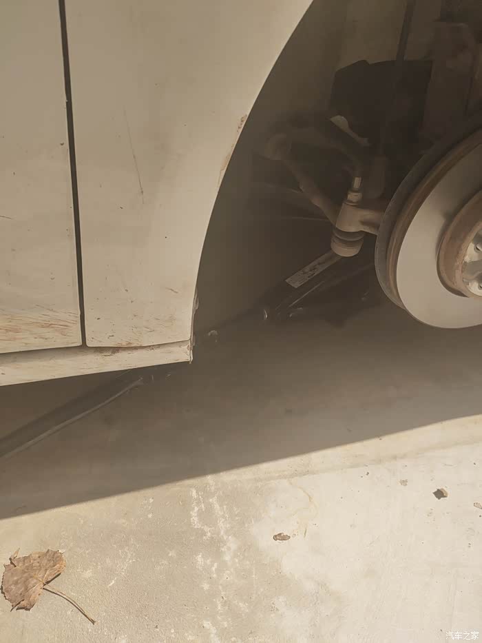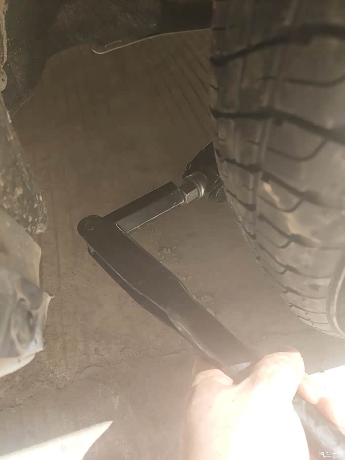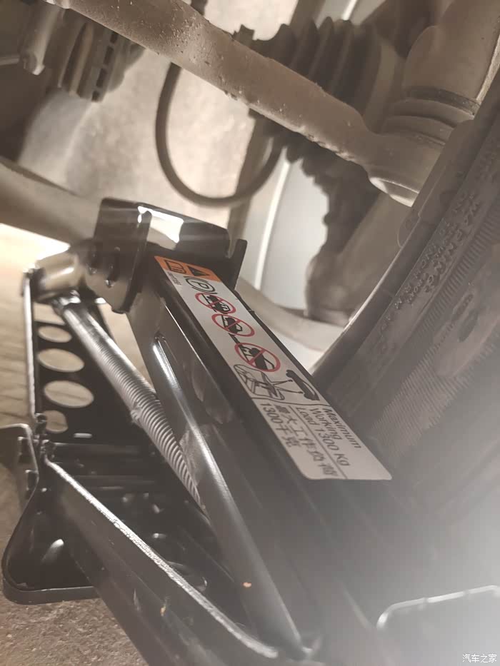 因为车胎爆了,一点气都没有,所以现在离地间隙非常的低额!然后也没有找到千斤顶该顶的位置,所以就随便顶了一个位置!