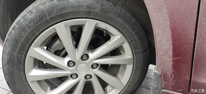 看胎壁其实已经有很多擦痕,但是原厂固特异御乘二代配合韧性的胎侧设计以及双层的帘布结构,能很好地保护轮胎内部。