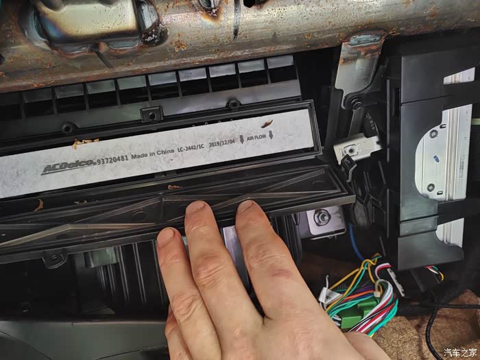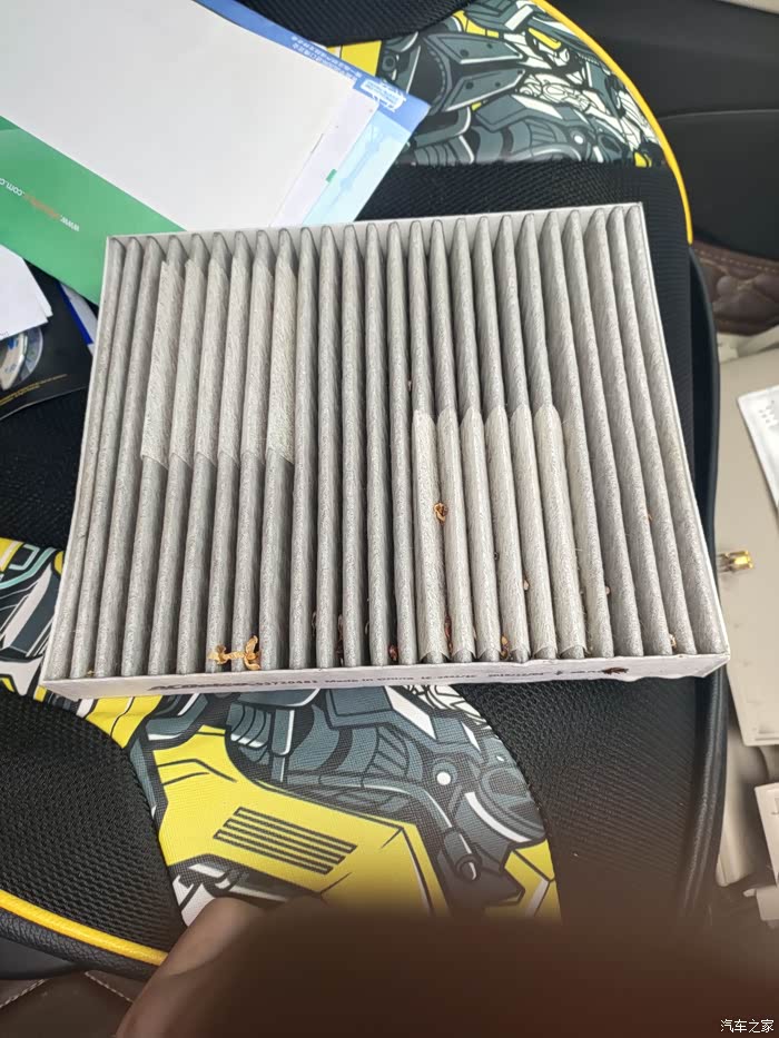 板开外面,里面的空调滤芯上面有好多脏东西啊!感觉这次换空调滤芯是非常正确的选择啊!