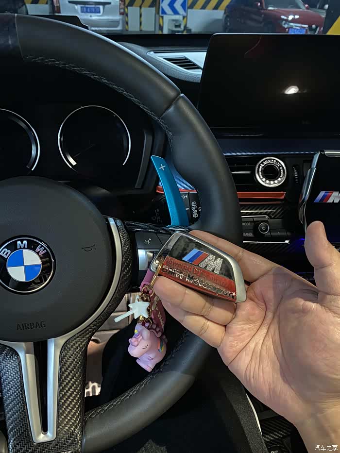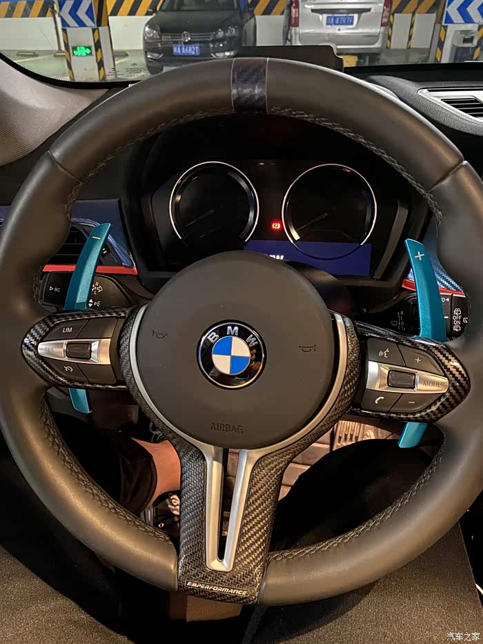 接下来是方向盘,原车选了舒适进入,所以就没有定速巡航了,但是这个功能有很实用,特别是像X1这种原厂没有ACC的车,跑长途真的不能没有定速巡航,所以我在加装换挡拨片的时候,顺便加了定速巡航,注意哦,不是更换方向盘总成哦,只需要更换原厂外壳,就可以加装换挡拨片,不过个人不是很喜欢原厂拨片的猪耳朵造型,然后在碳刀锋和铝合金拨片之间纠结了好久,最后选了这个青色铝合金的,加上自己贴的回正标,是不是有点运动的味儿了