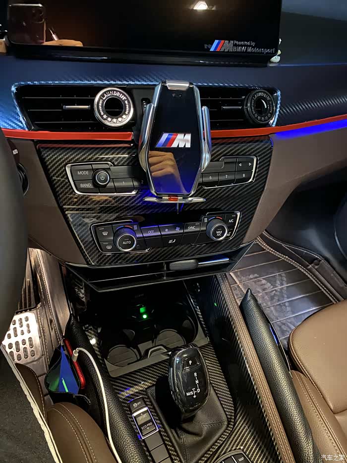 虽然是紧凑型SUV,但是宝马的内心还是运动,所以前唇尾翼必须安排上,我这都是某宝的塑料水转印碳纹,便宜又好看,有了前唇,整个前脸更加饱满了