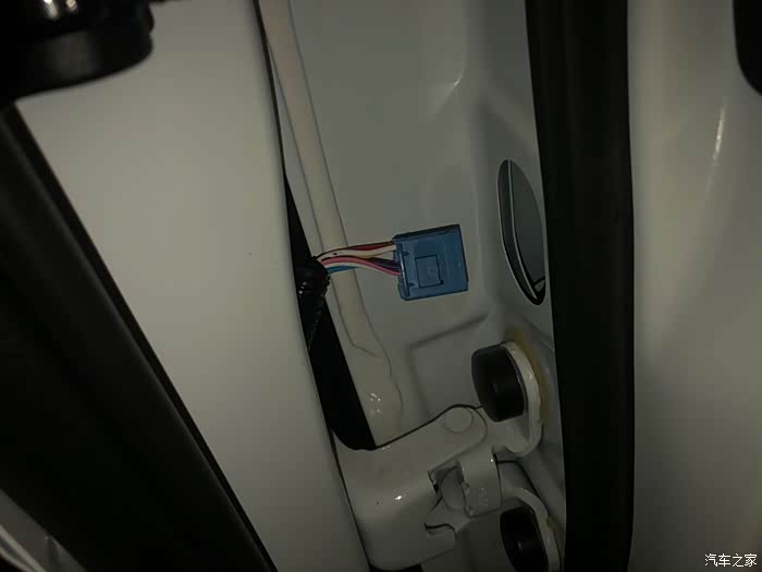 再把这个橡胶管从门柱那里,往后门里面挤进去,拉出来,白色插头这块,是有电工胶带固定的,先拿下来,再开始引线