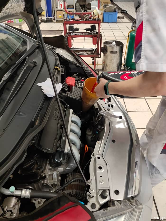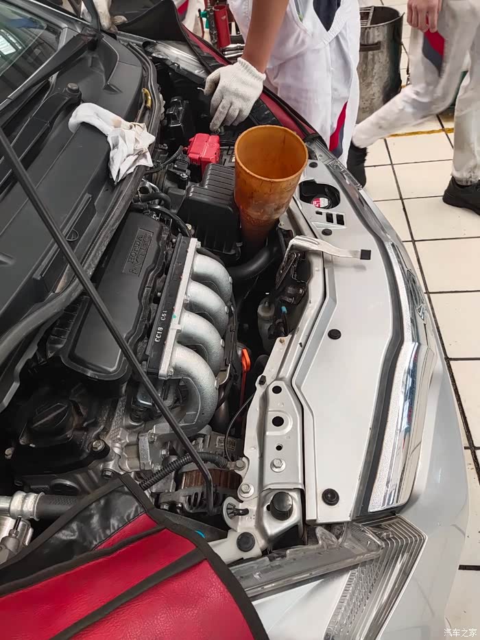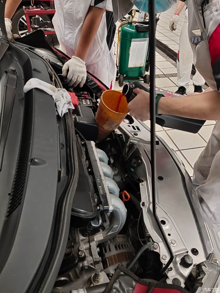 开始加油!新的油是红色的!大概加了2.3升……